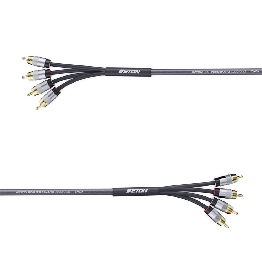 4-channel high-end SQ RCA cable, 5.5 m long. Twisted, fine-stranded inner conductors made of 100% oxygen-free OFC solid copper (20/0.12 mm). Multiple shielding through twisted inner conductors, metallized Mylar jacket shielding, and tinned copper braiding, as well as additional audio signal-side ground connection of the jacket shielding. Short metal plug housing (20.5 mm) with non-slip knurling. Marked signal flow direction. 24 K gold-plated, slotted center pin inner conductor and diagonally slotted outer conductor ring for maximum signal transmission and optimal contact pressure. Heavy-duty, translucent PVC jacket with special coating, highly flexible Y-Slickpants at the cable ends. Fixed color marking (red/white) for easy left/right identification. Freely selectable color marking with colored plastic rings. Engineered in Germany.