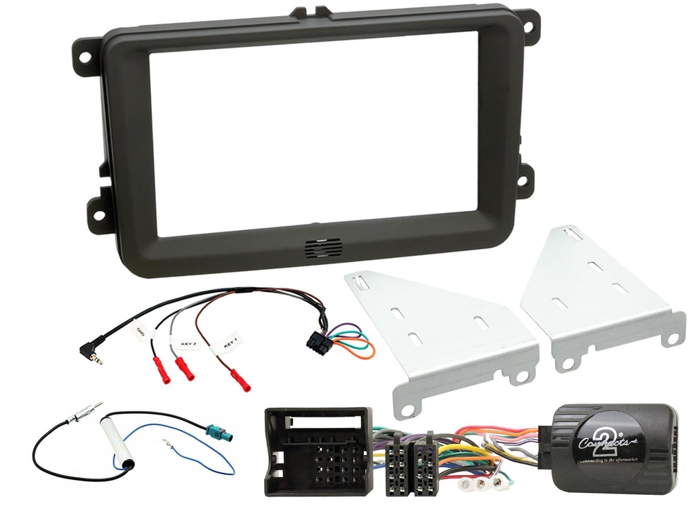Fuldt installations kit til modeller med standart VW radio. 40 Pin quadlock stik bag radio og kun 1 Fakra antenne. Modelfoto da der vises fakra iso adapter og iso din adapter