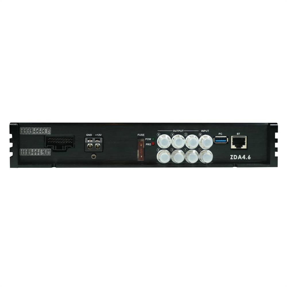 The ZDA4.6 is an extremely versatile Digital Signal Processor (DSP) with a built-in 4-Channel amplifier. The 6-channel DSP gives you all the features needed to create your perfect audio setup, such as fully adjustable filters, EQ with adjustable Q value and time correction.