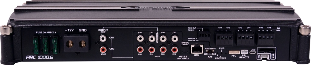 All three Arc Series amps produce roughly 1000 watts of power. The ARC 1000.6 is a six-channel amplifier rated to produce 175 watts per channel into 4- or 2-Ohm loads. Each pair of channels is bridgeable to produce 350 watts into a 4-Ohm load. All amplifiers feature fully balanced differential inputs to reject common electrical noise and allow for connectivity to OEM amplifiers. Speaker level input adapter plugs attenuate the signal from a factory amp by to simplify OEM integration. Each pair of channels has an adjustable sensitivity control. Multi-channel amps include a source selection switch to negate the need for Y-Cables. All three amplifiers include dual DC offset and signal detection remote turn-on detection circuits.
