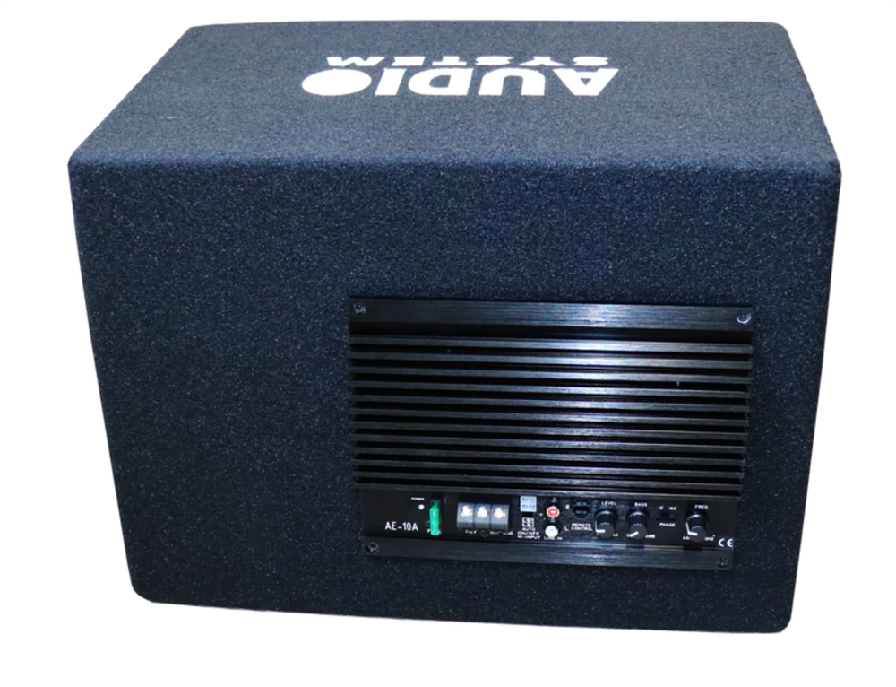 10-inch active subwoofer in a bass-reflex housing with built-in amplifier.