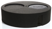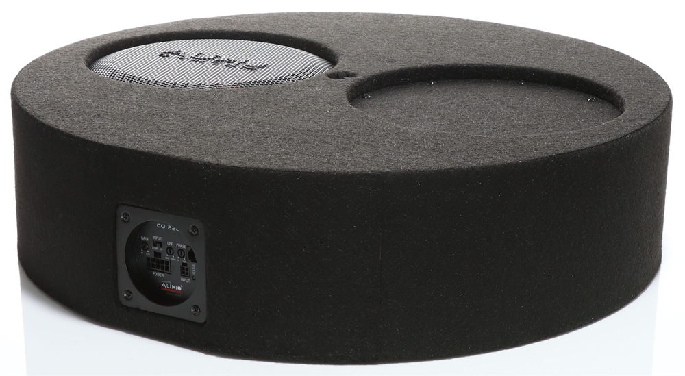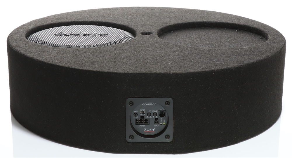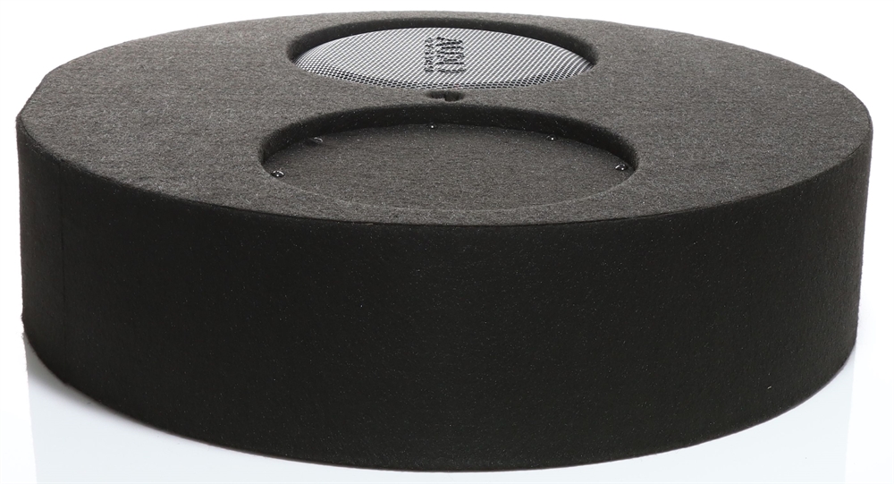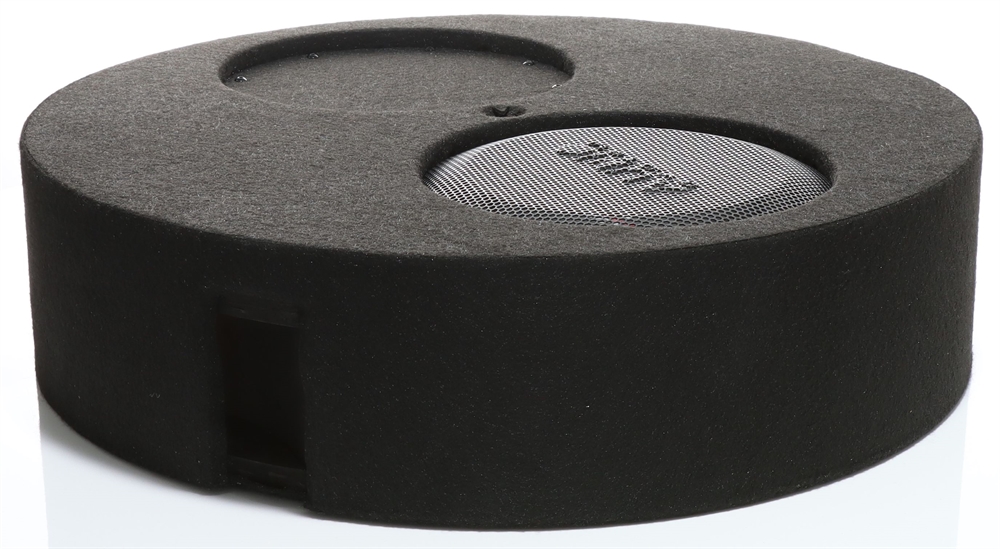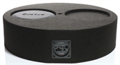 R-SERIES EVO SUBFRAME 23 l round vented box with R 08 FLAT EVO3-d4 high-strength housing made of MDF and internal bracing , Build in co-220.1 terminal amp, b = Ø 550 mm · h = 135 mm