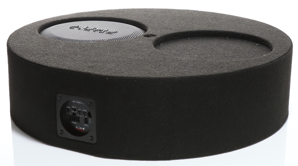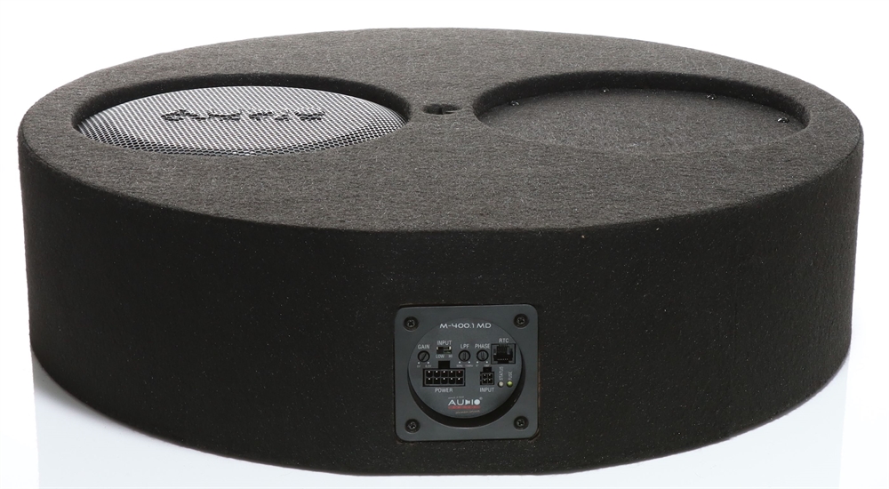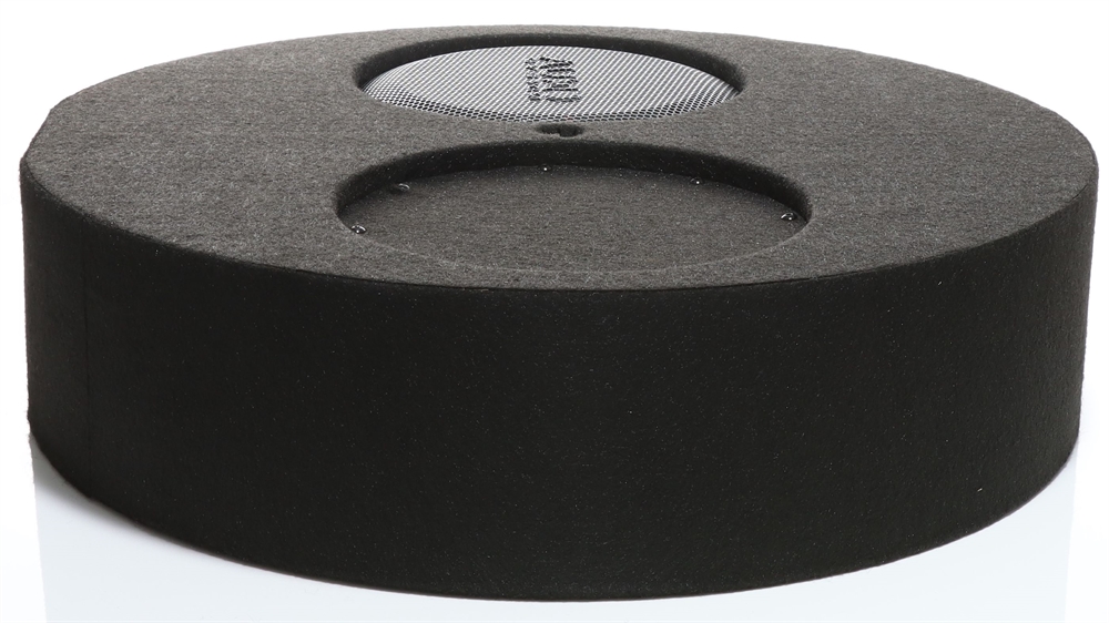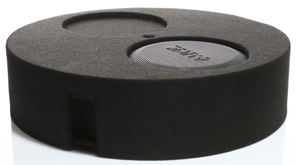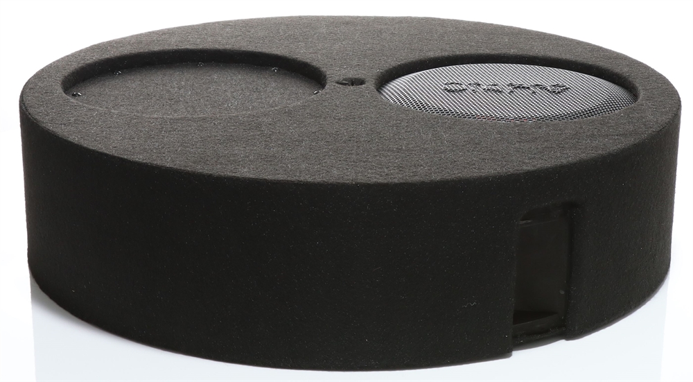 R-SERIES EVO SUBFRAME 23 l round vented box with R 08 FLAT EVO3-d4 high-strength housing made of MDF and internal bracing , Build in m-400.1 md terminal amp, b = Ø 550 mm · h = 135 mm