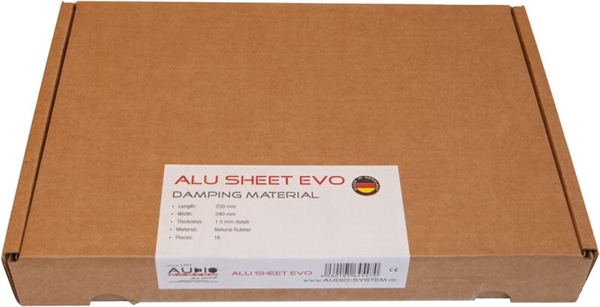 AUDIO SYSTEM ALU ARK 25x25CM (16STK=1M2) Forside » DÆMPNING » VIBRATIONS DÆMPENDE Varenr.: ALU Sheet evo DKKSEK PRIS PR. Pakke Pris ved køb af 1 Pakke,249,00 DKK På lager hos os Made in Germany Størrelse: 0,25 m x 0,25 m =ca. 1 m2 Tykkelse (totalt): 1,50 mm Gummi: 1,45 mm, Alu: 0,05 mm Vægt pr. 1 m2: 1,8 kg Kunder købte også AUDIO SYSTEM 19mm STOFTAPE 15M DKK 29,95 AUDIO SYSTEM SPRAYLIM 500ml DKK 119,00 50MM² AUDIO SYSTEM SORT OFC HIGH-Performance (soft-touch) pr.m DKK 170,75