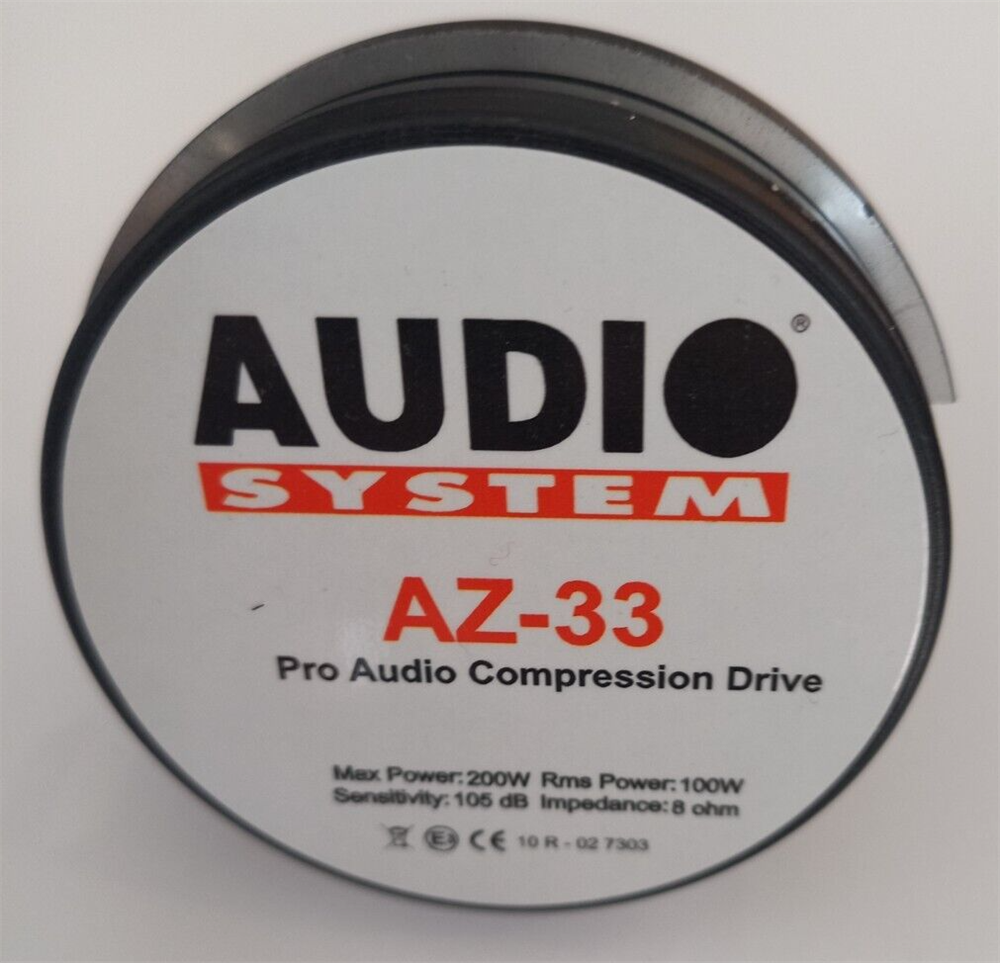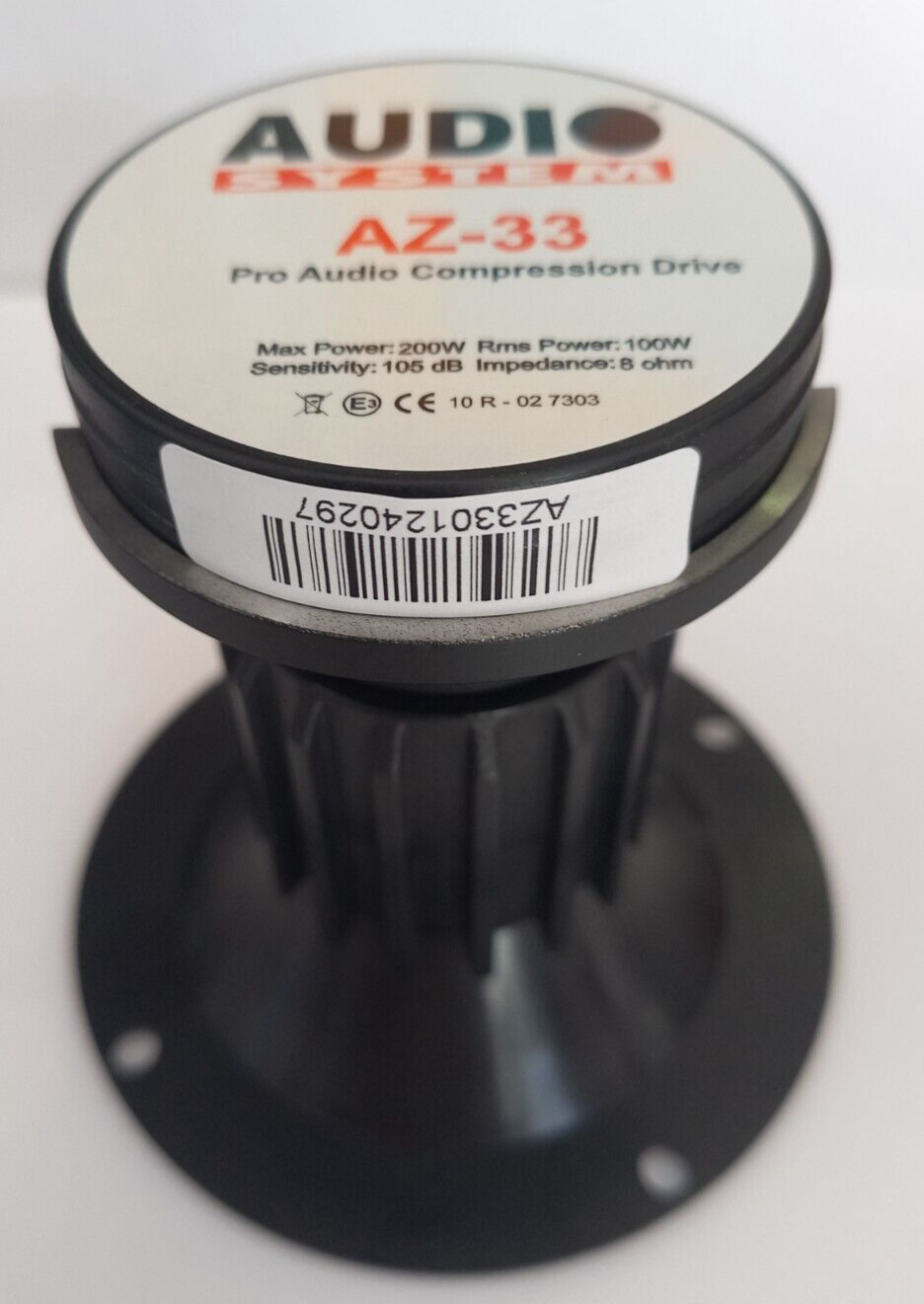 AUDIO SYSTEM AZ-33 KOMPRESSIONS HORNDISKANT Forside » MÆRKER » AUDIO SYSTEM ITALY Varenr.: AZ-33 DKKSEK PRIS ER PR. Stk Pris ved køb af 1 Stk,489,00 DKK På lager hos os kompressions driver med tragt ca 9,5cm høj og 10 cm i diameter 100 WATT RMS 200 WATT MAX 8 ohm 2khz-20khz sensitivitet 105 DB