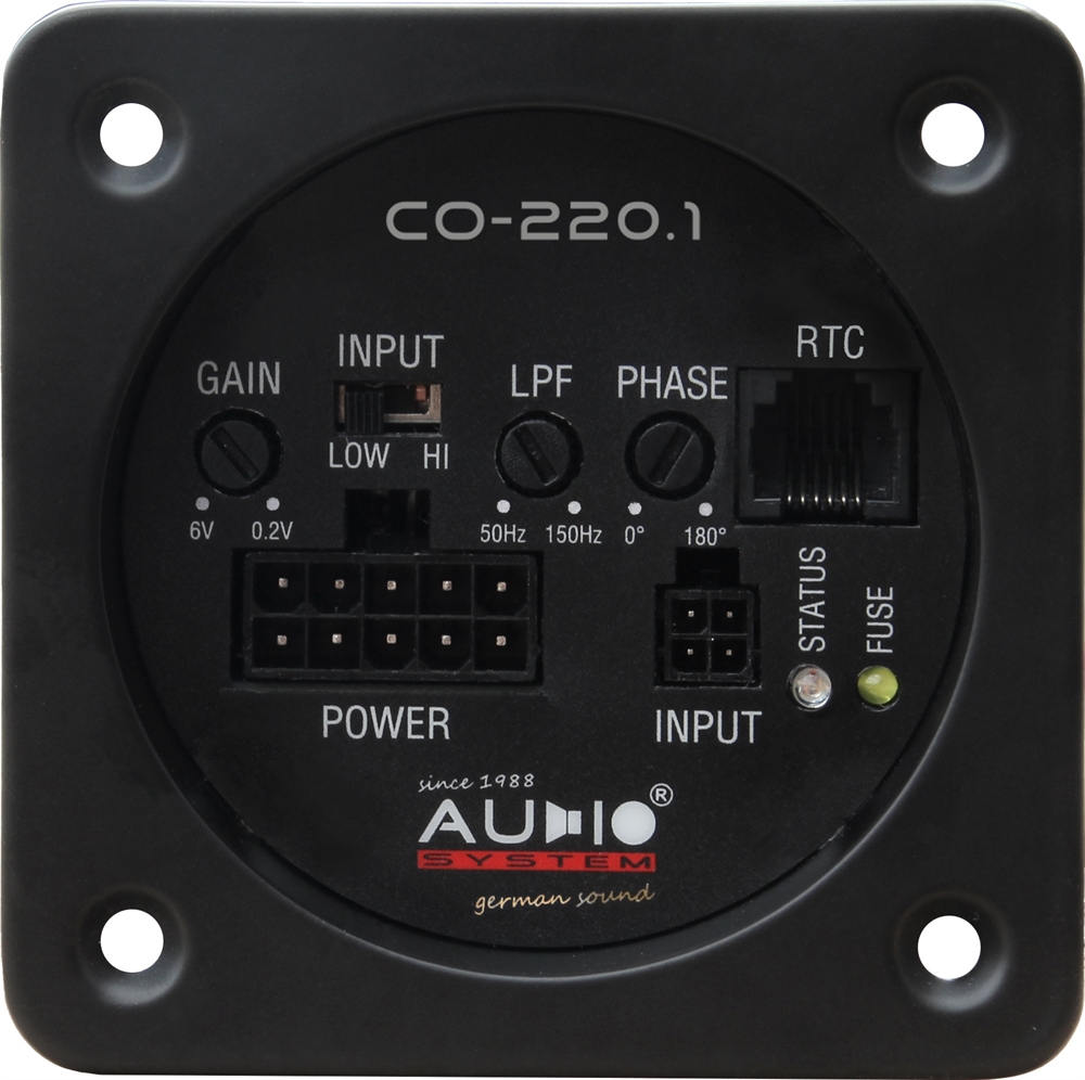 R-SERIES EVO SUBFRAME 23 l round vented box with 2 x R 08 FLAT EVO AND CO-220.1 terminal amp presented high-strength housing made of MDF and internal bracing, b = Ø 550 mm · h = 135 mm