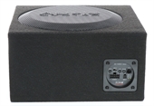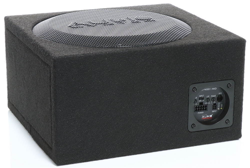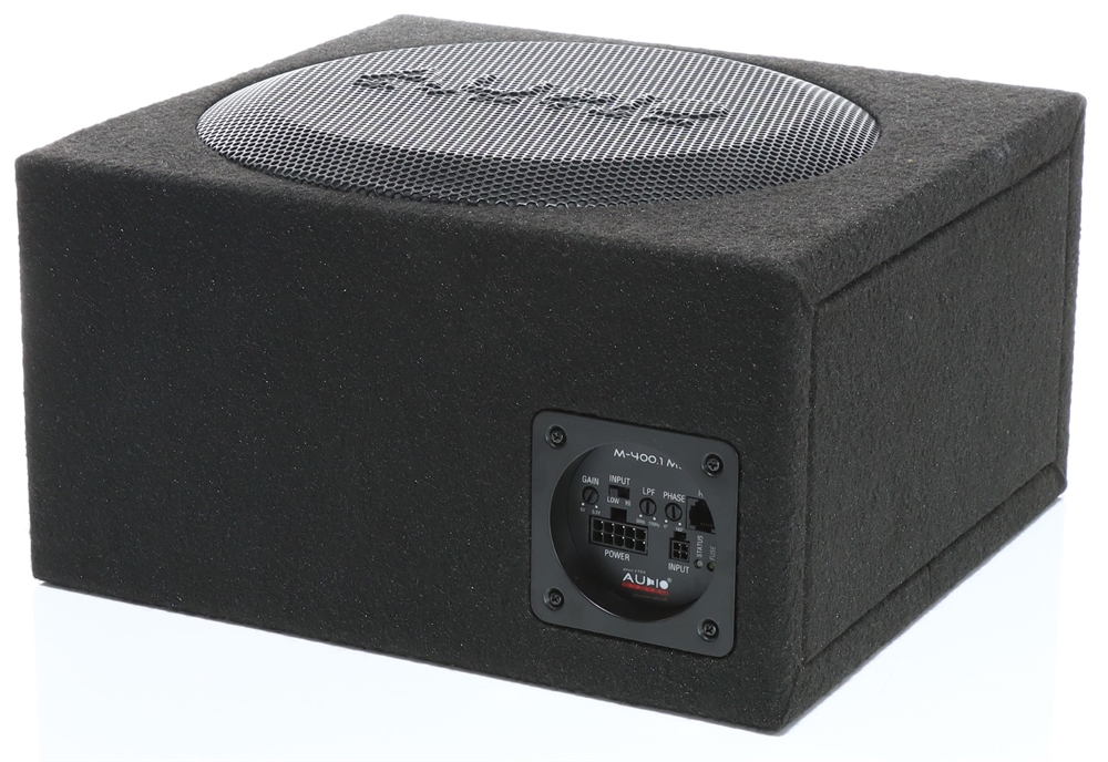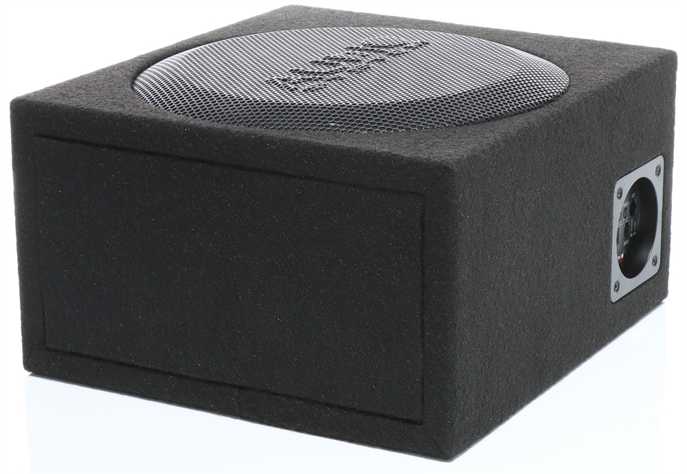 Lukket kabinet med m10-d4 sub og indbygget 400 W rms forstærker Kan bruges hvor man vil stående i hjulbrønd. direkte i bagagerum eller under/mellem sæder i varebiler.
