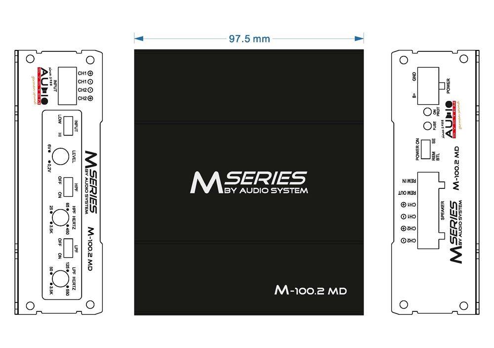 2-channel Digital high power-amplifier with SMD technology variable switchable Subsonic, HP, LP, BP filter and full active mode possible, high-level-input or signal detection with automatically "TURN ON", remote control RTC (optional) 2x 100(150) WRMS at 4(2) Ohm or 113x38x100 mm