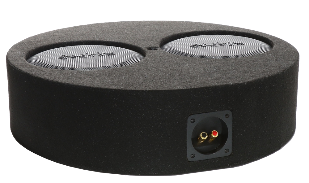 R-SERIES EVO SUBFRAME 23 l round vented box with R 08 FLAT EVO hole for second R 08 Flat EVO presented high-strength housing made of MDF and internal bracing 2 x 275/175 Watt, impedance: 2 x 4 Ohm, b = Ø 550 mm · h = 135 mm