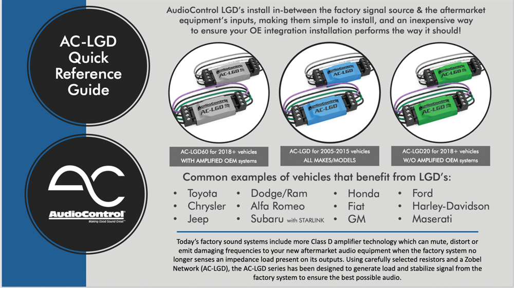 Today’s factory amplifiers feature built in protection circuits which can mute some or all audio outputs when the factory speakers are removed. The AC-LGD 60 has been designed to generate load and stabilize signal from amplified factory system to ensure the best possible audio.