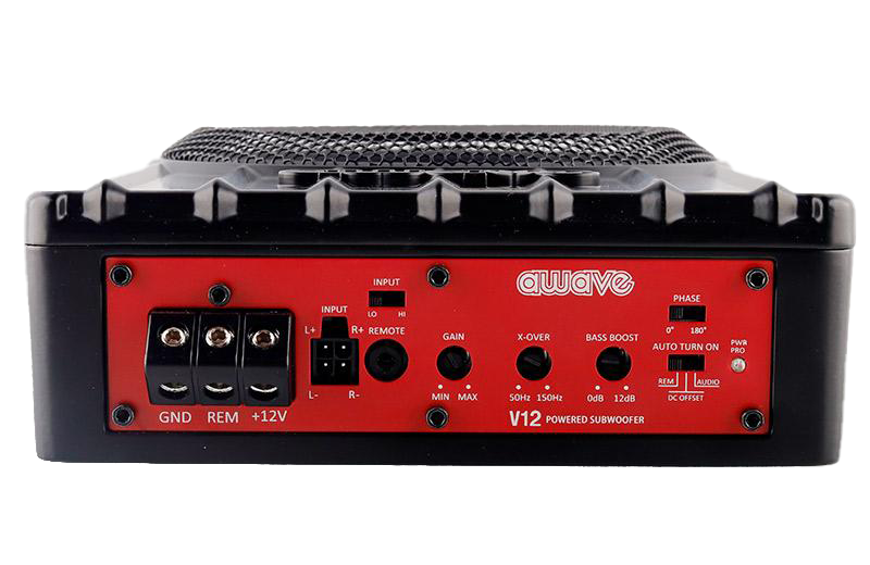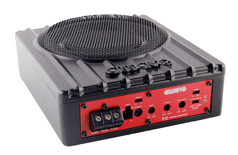 Bass is in the smallest hut –If mounting space in the vehicle is scarce and existing car hifi systems badly need the "extra kick" in the low frequency range without great effort, the new AWAVE active subwoofers V12 are the right choice. Driven by powerful, integrated Class D amplifiers with 200 W RMS, the heavy-duty drivers with their rock-solid aluminum cones and heat-resistant voice coils easily transform the amplifier power into punchy bass. Thanks to comprehensive setting options like the adjustable, high-slope lowpass filter and particularly sensitive phase control, the low frequency reproduction can be perfectly adapted to the acoustic conditions inside the vehicle. Equipped with a 2-channel highlevel input with automatic turn on function as well as a 2-channel lowlevel RCA input a seamless integration is guaranteed. And thanks to the especially shallow cabinet design the installation will be a no-brainer, especially if space is extremely limited – these small "bass boosters" may even fit under the seats, for example.