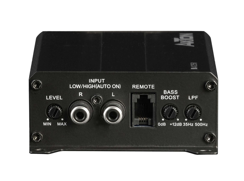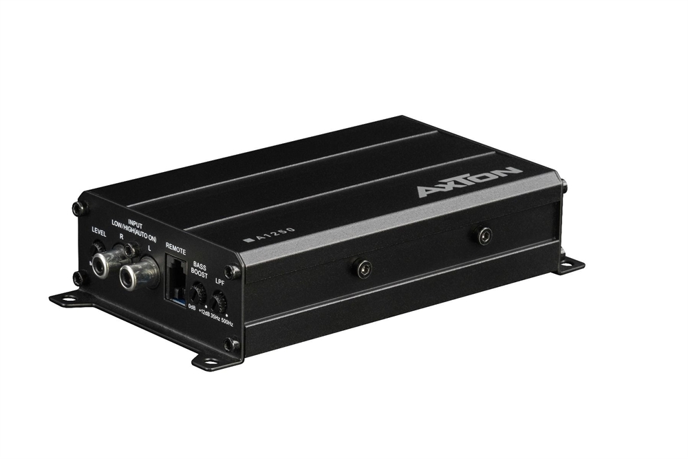 The AXTON digital amplifier has an integrated 12 dB/oct. low-pass filter, continuously adjustable from 35 - 500 Hz, as well as a bass boost function @ 50Hz (0 - 12dB). There is also a cinch input and a high level input with auto-turn-on function for connecting the A1250 to factory radios without RCA output - this allows the amplifier to be easily connected to the ex-works radios. A bass level remote control is also included in delivery.
