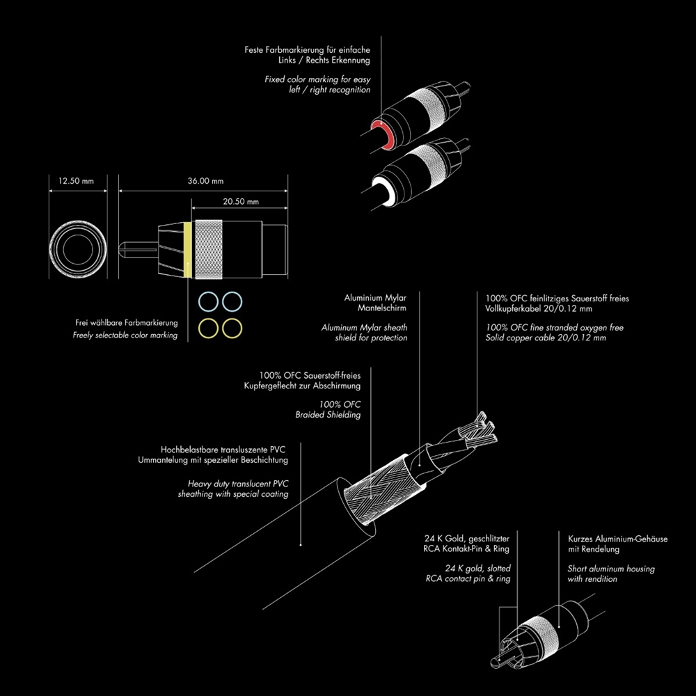 4-channel high-end SQ RCA cable, 5.5 m long. Twisted, fine-stranded inner conductors made of 100% oxygen-free OFC solid copper (20/0.12 mm). Multiple shielding through twisted inner conductors, metallized Mylar jacket shielding, and tinned copper braiding, as well as additional audio signal-side ground connection of the jacket shielding. Short metal plug housing (20.5 mm) with non-slip knurling. Marked signal flow direction. 24 K gold-plated, slotted center pin inner conductor and diagonally slotted outer conductor ring for maximum signal transmission and optimal contact pressure. Heavy-duty, translucent PVC jacket with special coating, highly flexible Y-Slickpants at the cable ends. Fixed color marking (red/white) for easy left/right identification. Freely selectable color marking with colored plastic rings. Engineered in Germany.