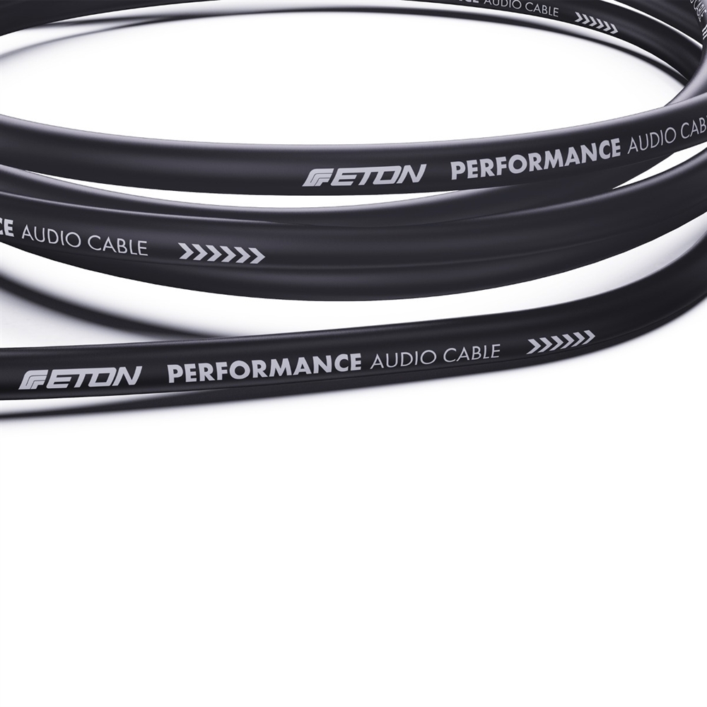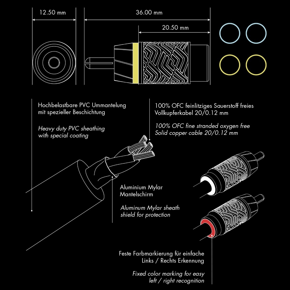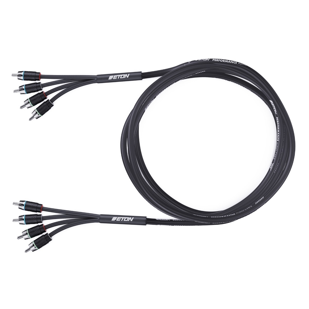 4-channel cinch cable (RCA), 5.5 m long. Twisted, fine-stranded inner conductors made of 100% oxygen-free OFC solid copper (20/0.12 mm). Multiple shielding through twisted inner conductors, metallized Mylar jacket shield and additional audio signal-side earth connection of the jacket shield. Short plastic plug housing (20.5 mm) with non-slip ETON pattern. Marked signal flow direction. Slotted center pin inner conductor and diagonally slotted outer conductor ring for maximum signal transmission and optimum contact pressure. Heavy-duty black PVC sheathing with special coating, highly flexible Y-slickpants at the cable ends. Fixed color marking (red/white) for easy left/right identification. Freely selectable color marking with colored plastic rings. Engineered in Germany.