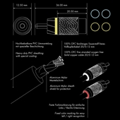 High-quality, extremely flexible and cost-effective RCA cable. Pseudo-parallel balanced cable construction with twisted hot/GND inner conductors and an outer shield made of metallized Mylar. The additional, one-sided connection of the earth to the metallic outer shield provides interference suppression and protection against possible unwanted interference and gives the cable its signal flow direction. Specially developed, short plastic connector housings enable easy installation even where space is limited. The highly conductive contact pins are slotted and spread out during connection - just like the diagonally slotted outer conductor ring - and thus ensure a contact-safe connection for maximum transmission quality. Heavy-duty and flexible black PVC outer jacket provides effective protection against moisture and mechanical stress and is easy to pull and lay through narrow gaps. Y-slickpants at the cable ends provide additional protection: made of high-quality silicone, they are very flexible, resistant, temperature-resistant and particularly durable.