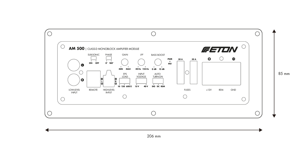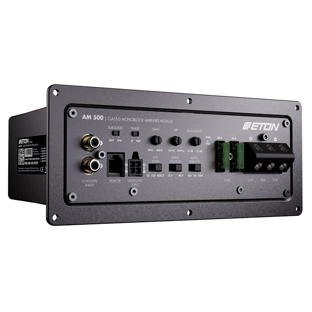 New, extremely powerful 1-channel active amplifier module with Class D circuitry. Highly stable and airtight die-cast aluminum housing with cooling fins, perfectly suited for installation in do-it-yourself (DIY) subwoofer enclosures. Smart, elongated dimensions for easy integration even in more specialized subwoofer enclosure designs. 3-stage power adjustment/power limiter via jumper up to 1 x 540 W RMS at 4 ohms! Integrated subsonic filter, low-pass filter, low-level input (RCA), high-level input with adjustable audio signal input voltage and input impedance, auto turn-on function (SIG/DC detection), phase shift 0°/180°, bass boost, adjustable input sensitivity (GAIN), and wired remote level control.
