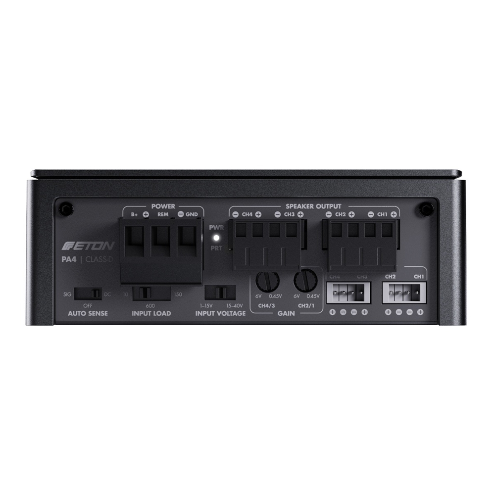 4-channel Advanced Class-D amplifier with state-of-the-art amplifier technology and high-quality die-cast aluminum housing with removable cover. The integrated adjustment tool makes it easy to adjust the amplifier, even overhead or in confined spaces. Full performance in the smallest size with asymmetrical power distribution: CH1/2 2 x 45 W at 4 Ω + CH3/4 2 x 80 W at 4 Ω, CH1/2 at 2 Ω not supported + CH3/4 2 x 140 W at 2 Ω, CH1/2 power bridged at 4 Ω not supported + CH3/4 1 x 280 W at 4 Ω bridged. Signal-to-noise ratio 78 dB, damping factor @ 4 Ω >65, ultra low THD+N 0.01% @ 10 W 1 kHz, high-pass active filter CH1/2 & CH3/4: 50 - 5000 Hz, low-pass active filter CH1/2 & CH3/4: 50 - 5000 Hz, auto-sense on function (SIG / DC), switchable audio input signal on CH1-4, gain 0. 45 V - 6 V, adjustable high-level input voltage 1 - 15 V | 15 - 40 V, adjustable high-level input resistance 10| 150 | 600 Ω, 4 x audio input (high- & low-level), variable mounting feet, detachable connection plugs for power and audio signal cables, smart dimensions (LxWxH) 128 x 100 x 45 mm.
