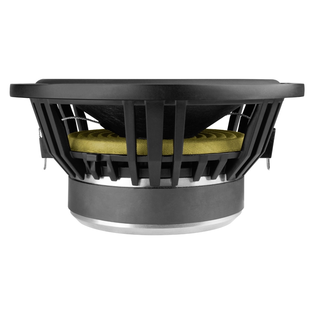 High-end 165 mm (6.5 inch) woofer/midrange with carbon fleece sandwich cone, anodized aluminum dustcap for optimized heat dissipation and symmetrical stranding guidance with voice coil ventilation. Extremely torsion-resistant die-cast aluminum basket with optimized ventilation and strong ferrite magnet, 4 ohms impedance, 90 W RMS rated power handling, 140 W music power handling, 87 dB characteristic sound pressure, Made in Germany manufacturing and development.