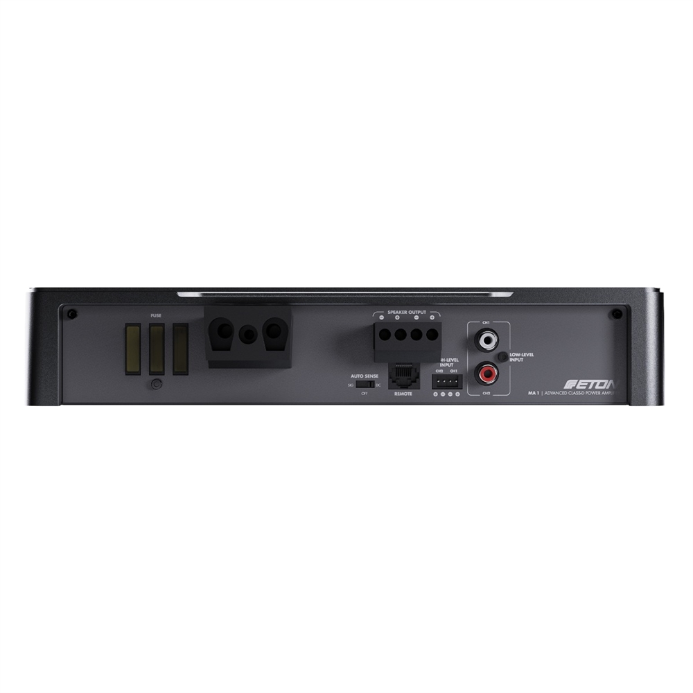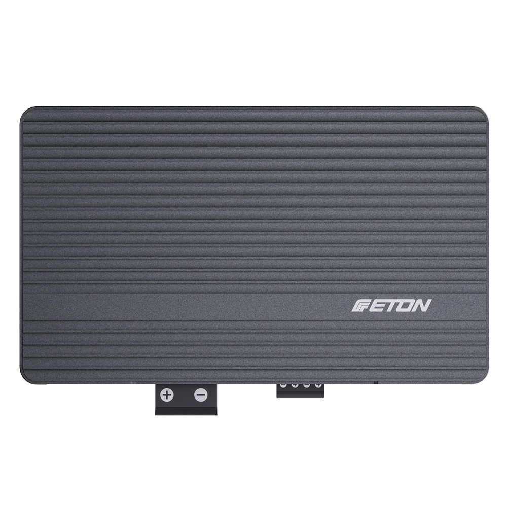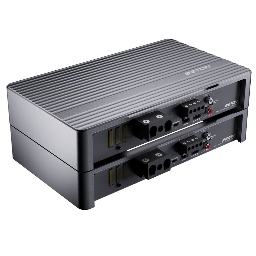 State-of-the-art Advanced Class-D amplifier technology in a smart installation dimension of just 270 x 160 x 51 mm. High-quality die-cast aluminum housing in gunmetal finish. High-performance 1-channel monoblock amplifier with 1 x 690 W RMS at 4 Ω, 1 x 1120 W RMS at 2 Ω and 1 x 1510 W RMS at 1 Ω, signal-to-noise ratio 96.5 dB, damping factor @ 4 Ω >340, Ultra Low-THD+N 0.003 @ 100 W 60 Hz, subsonic filter 30 Hz, active filter low-pass: 25 - 250 Hz with adjustable slope 12 dB / 24 dB Oct, Auto Sense-On function: SIG / DC, 2 x high level inputs, 2 x low level inputs (RCA), High level input signal voltage: 1 - 15 V | 15 - 40 V, High level input resistance: 10 | 150 | 600 Ω, adjustable gain 0.45 V - 6 V, removable connection plugs (power and audio signal), removable aluminum cover (ETON logo rotatable 180° upside down), integrated adjustment tool for active filter and gain settings, LED status lightbar, stacking function of several amplifiers, hidden mounting by means of blind holes or easy mounting by means of removable and adjustable mounting feet, incl. Level remote control, high-level cable adapter, mounting feet and fixing screws. Engineered in Germany.