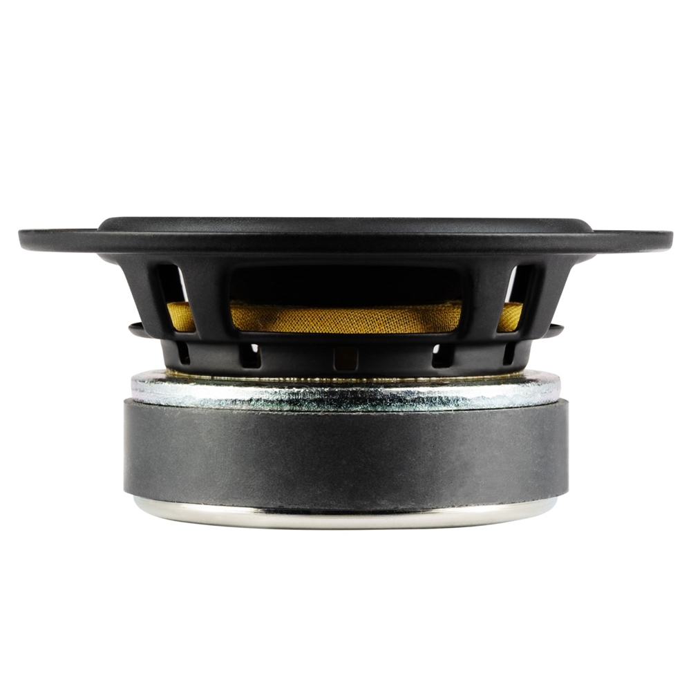 80 mm (3") multilayer paper-fiberglass fabric cone with special coating, powder-coated & stiffened metal basket with ventilation holes. High quality 2.8 / 4.8 mm connector plug terminals. CNC over-turned T-joke with large core bore for best possible ventilation without flow noise. Soft cover dome for tonal neutrality. 4 ohms impedance, rated / music power handling: 20 / 30 W. Outer diameter 95 mm, cut-out diameter 74 mm, installation depth 38.9 mm. Incl. speaker cover grille with rings and mounting accessories. Manufacture and development Made in Germany.