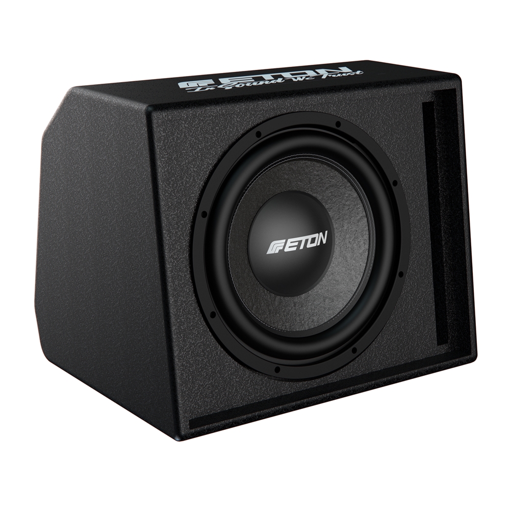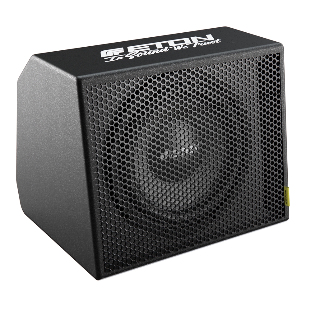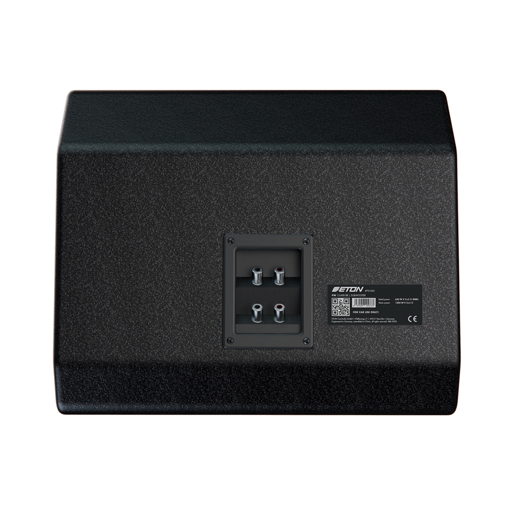 300 mm (12 inch) passive cabinet subwoofer with solid MDF wooden cabinet, painted hammer finish, bass reflex construction with port. Powder coated, solid metal grille with ETON badge, embroidered. Pressed and stiffened paper cone, long stroke surround, strong ferrite magnet, dual port terminals, 600 W RMS, 1200 W music power handling, 2 x 2 ohms impedance, 460 x 370 x 375 mm (LxHxD), 19 kg.