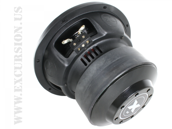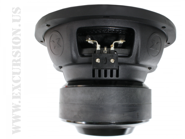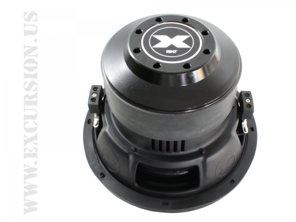 So we wind our proven and ventilated aluminum coil former with pure OFC copper up to a winding height of 45mm and result with this generation SXT already an outperform parameters of the several more expensive first generation SXE and SXX series and with comparably large motors. New requirements for centering are here in double execution with reinforced linear NOMEX centering perfectly locked in multiple screwed rings and blood red design. Color accents that repeat in the seams of the oversized high-density surrounds and lettering. Of course, all other known EXCURSION standards can be found in the SXT like our massive double 8GA/10mm² high current terminals and here with a 300oz dual stack motor which with a necessarily extended pole plate which oversized ventilation openings have the charm of a revolver that just wants to be charged.