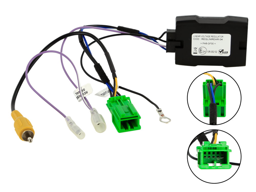 Je nach Fahrzeug und Ausstattung stellt der Adapter das Videosignal Cinch, eine Spannungsversorgung +6V/Masse für die OEM Kamera und das Rückfahrsignal zur Verfügung.