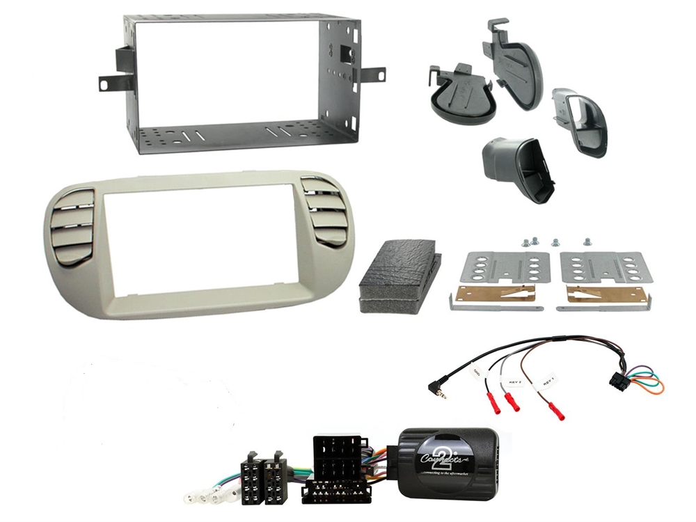 Fiat 500 Installation Kit. Supplied with ivory double DIN fascia panel, CAN-Bus steering wheel control interface, universal patch lead