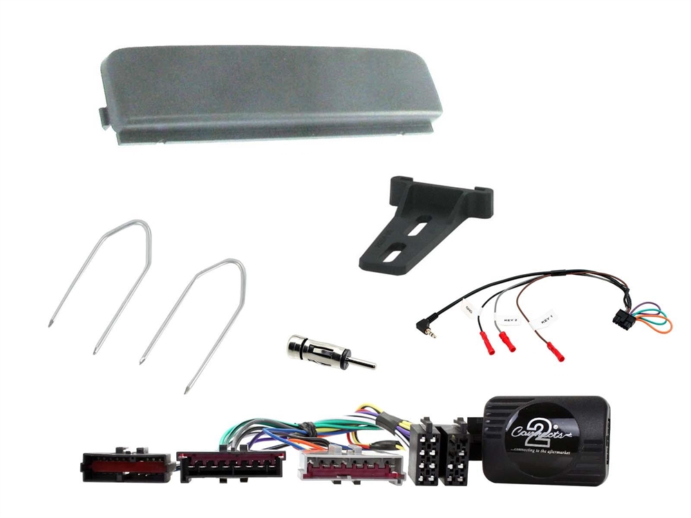 Ford Installation Kit. Supplied with a silver single DIN fascia, a resistive steering wheel control interface, an antenna adapter, a set of universal release keys, and a universal patchlead. Please note: steering wheel control interface not compatible with Ghia/ST models.