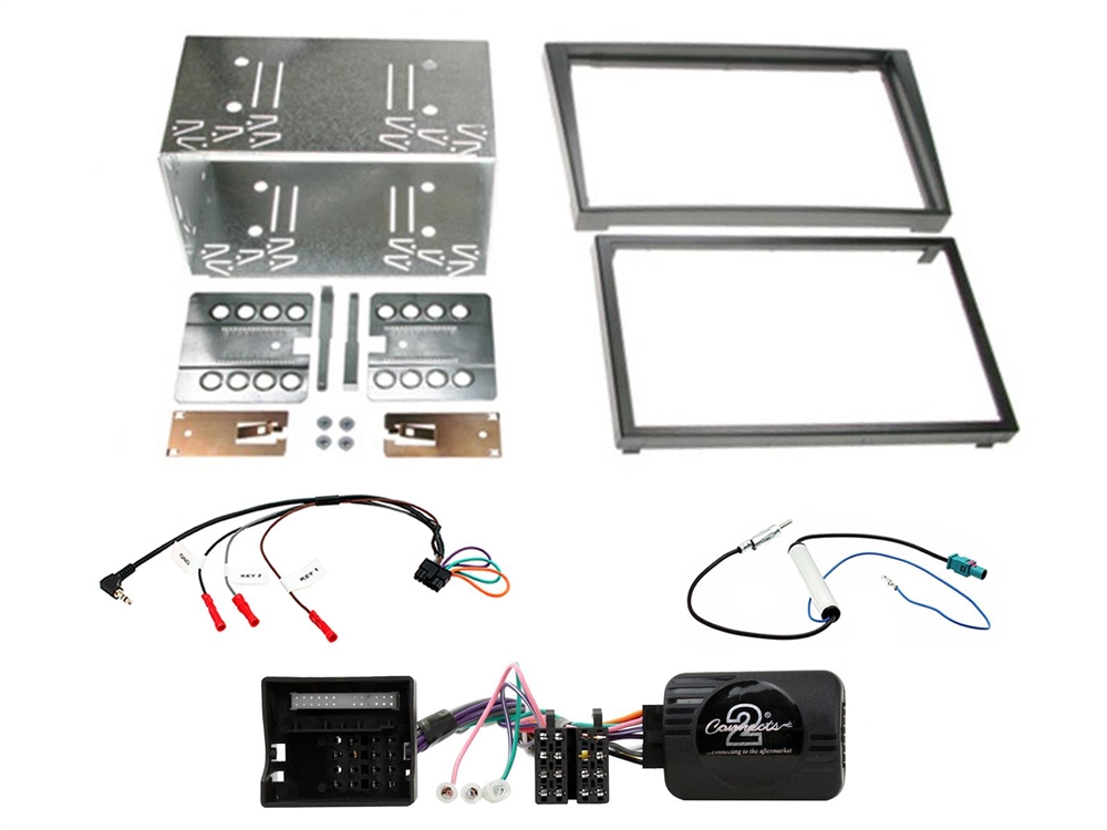 Installation kit for various Vauxhall vehicles. This kit comes supplied with a charcoal double DIN fascia kit, a steering wheel control interface, an antenna adapter and a universal patchlead.