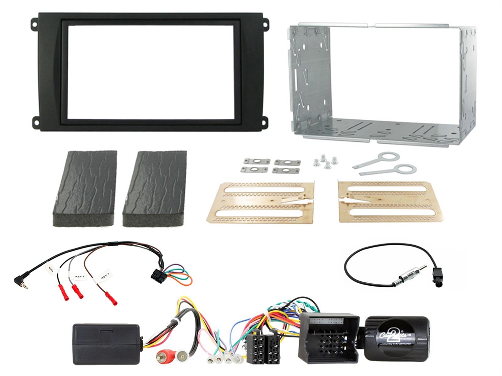 Complete installation kit for Porsche Cayenne vehicles with separate fibre amp and PCM3 system - includes double din fascia, steering wheel control, antenna adapter and universal patchlead.