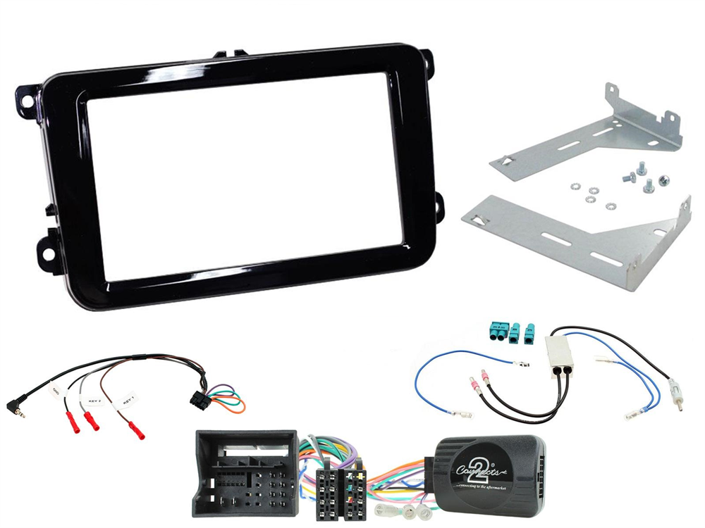 Fuldt installations kit til modeller med standart VW radio. 52 Pin quadlock stik bag radio (MIB-PQ) og 2 Fakra antenner. Både dobbelt og 2 enkelte fakra. (ikke til mørkeblå og rigtig grøn og gul da det er gps og usb). Sættet leveres med Piano sort ramme som er samme farve som de fleste headunits.