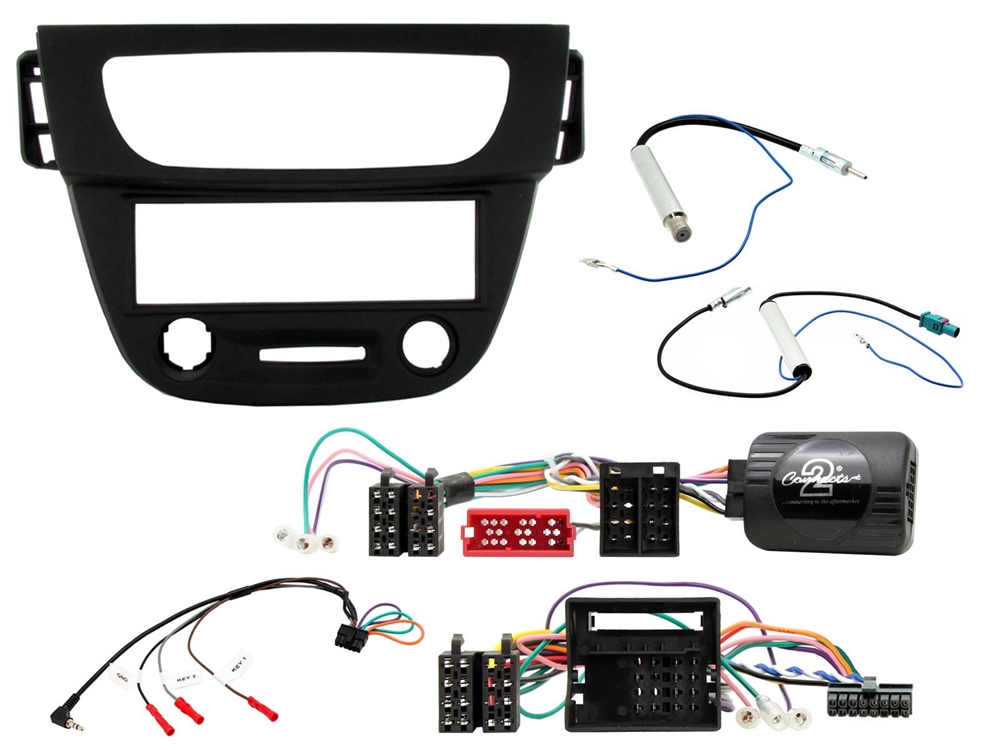 Installation Kit for the Renault Megane. This installation kit comes supplied with a dark grey single DIN fascia panel, a steering wheel control interface, an antenna adapter and a universal patchlead.
