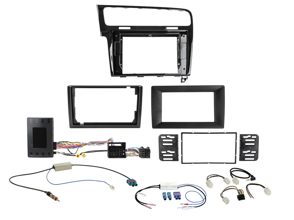 Komplet kit med rammer til 10". 9" og almindelig 2-Din samt infoadapter og 8,5V/ 12V antenne adapter (husk at mål inden udskift)