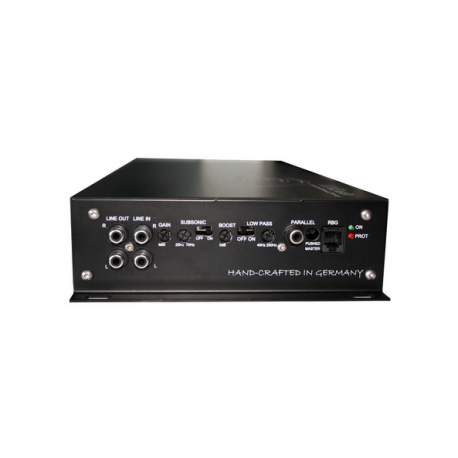 The professional amplifiers feature about auto remoute, 12dB stepless Adjustable high low pass filter, 18 dB Bass Boost / 45 Hz, 12 dB Subsonic filter of 10-100 Hz Bandpass filter, 2/4 Ch. RCA input Switches are 1 ohm load stable per Channel, protection electronics for Overvoltage, undervoltage, Overload, over temperature and Reverse polarity. At the K1 and K2 Models is a bassremeggain available seperately.