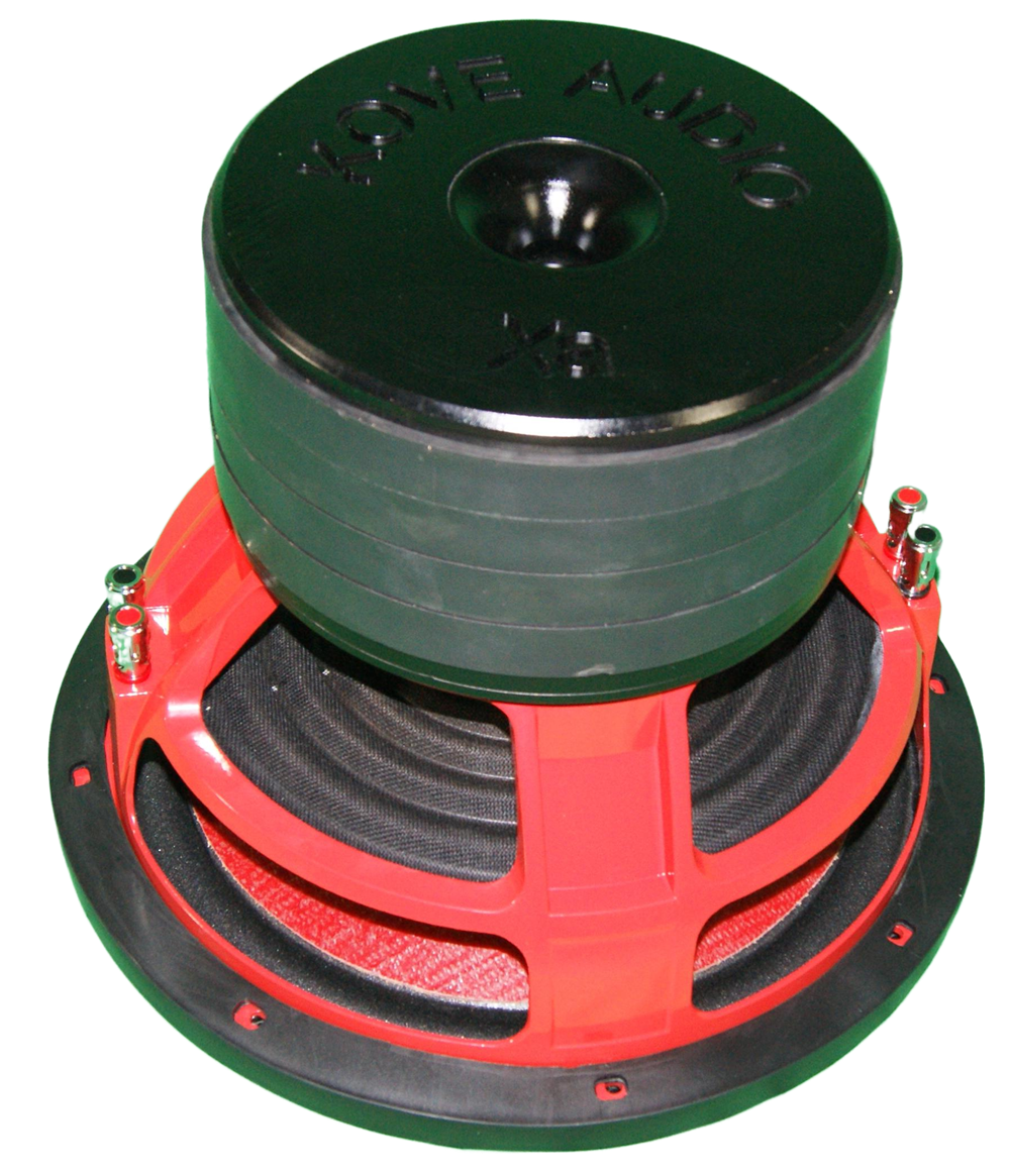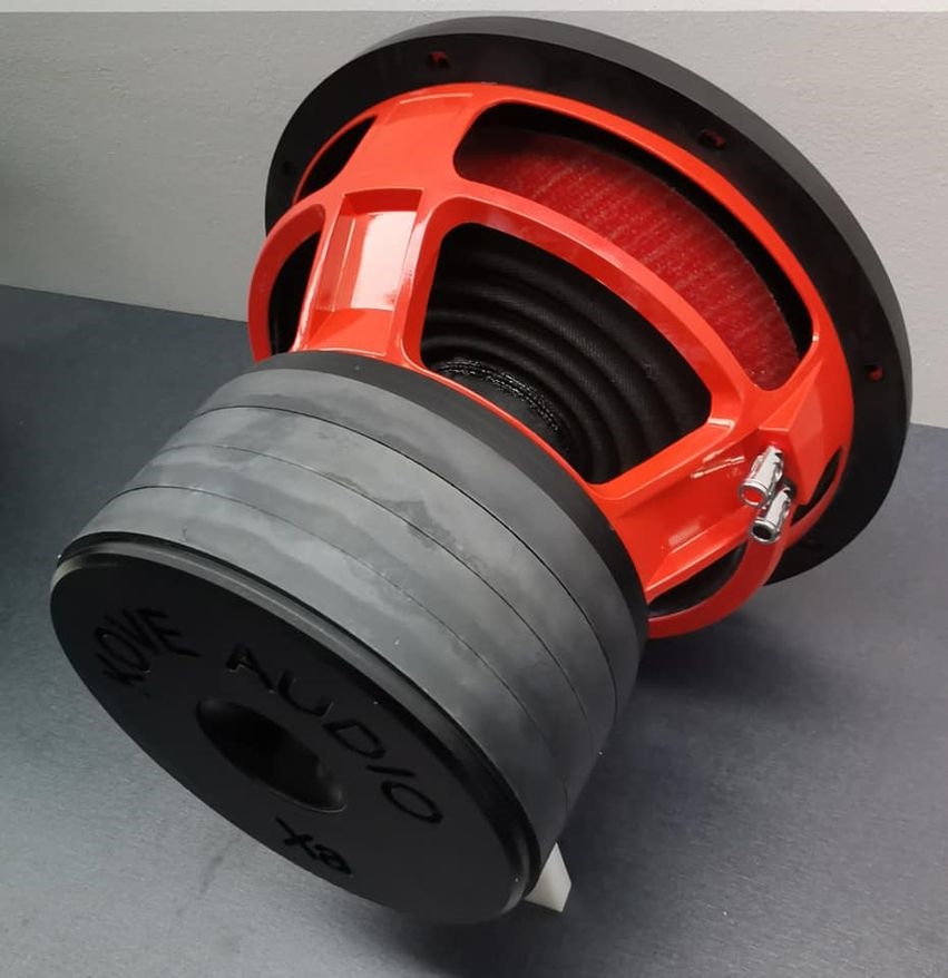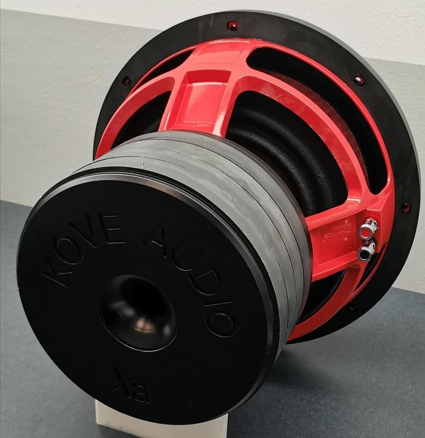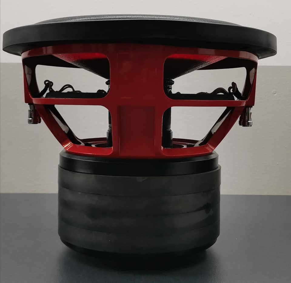 Woofer 54cm 3500W RMS og 15000W spl peak, Lav afstemning, Dobbelt 1 Ohm, 3” Fladviklet 70mm høj svingspole, 700 Oz Motor, 4 x spider, lang vandring. stabil Glasfiber compound Membran, Støbt Chassis, KOVE Air-comp kølesystem. Optimeret til åbne og bandpass kasser.