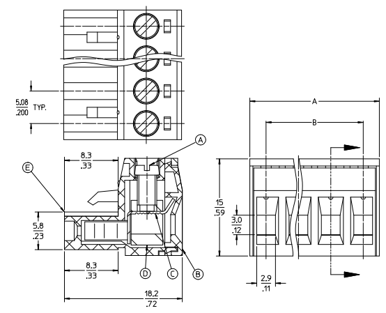 4 Position Klemmeblok Stik, Hunfatninger 0,200" (5,08mm) 180° Frithængende (In-Line)