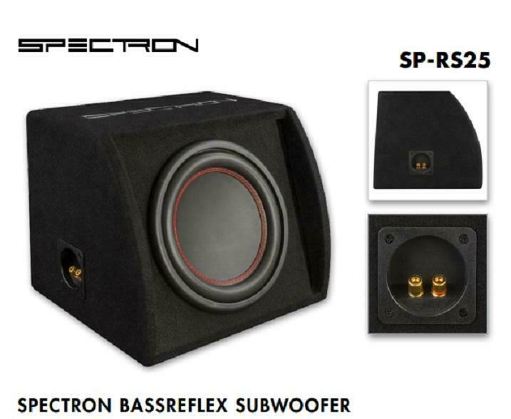 The SP-RS25 is a powerful subwoofer in a bassreflex cabinet, equipped with a 25 cm/10“ SPECTRON woofer with 400 watts peak input power. The stable 15 mm enclosure, only a minimum of 31 cm high, is made of wood-based material and covered with durable carpet. The rear of the enclosure is beveled so that the bass box takes up as little space as possible when positioned at the backrest of the rear seat – so the SP-RS25 will find a place in almost every trunk. A contact-safe screw terminal is available for connecting the bass box.