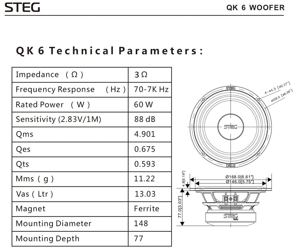- fs=68Hz, Qms=4,9 Qes=0,675 Qts=0,59 VAS=13,0L, Mms: 11,22g