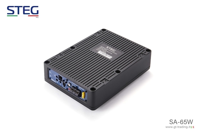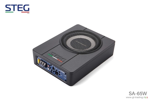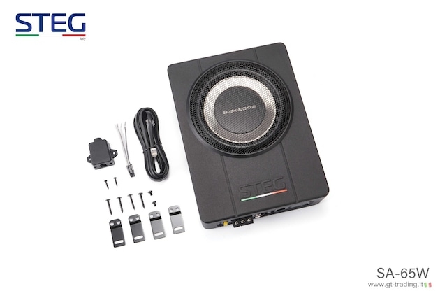 Bass is in the smallest hut –If mounting space in the vehicle is scarce and existing car hifi systems badly need the "extra kick" in the low frequency range without great effort, the new STEG active subwoofers SA-65W are the right choice. Driven by powerful, integrated Class D amplifiers with 100 W RMS, the heavy-duty drivers with their rock-solid aluminum cones and heat-resistant voice coils easily transform the amplifier power into punchy bass. Thanks to comprehensive setting options like the adjustable, high-slope lowpass filter and particularly sensitive phase control, the low frequency reproduction can be perfectly adapted to the acoustic conditions inside the vehicle. Equipped with a 2-channel highlevel input with automatic turn on function as well as a 2-channel lowlevel RCA input a seamless integration is guaranteed. And thanks to the especially shallow cabinet design the installation will be a no-brainer, especially if space is extremely limited – these small "bass boosters" may even fit under the seats, for example.