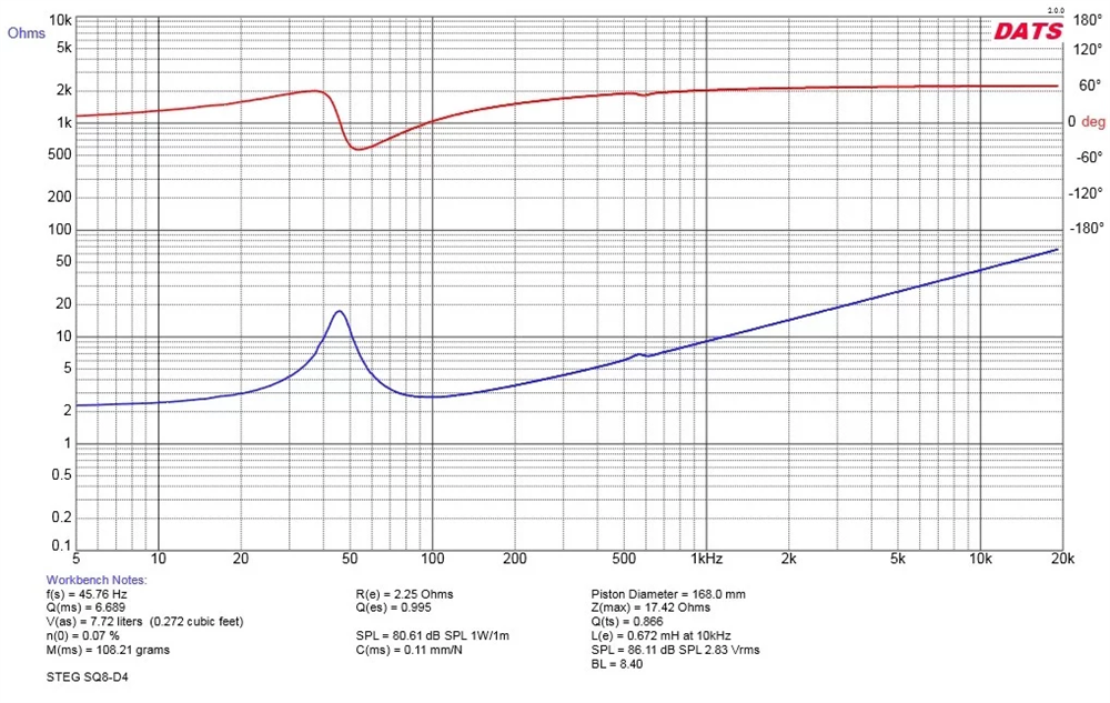 With the aim of providing high acoustic performance even when used with lower power, the SQ8-2 (2+2ohm) and SQ8-4 (4+4ohm) were designed for use in an 8.5 liter reflex enclosure. The components of the STEG SQ8 subwoofer have been developed with a primary objective: to provide high power in tight spaces. The exit is a matter of excursion; the more air the cone moves, the more output there will be. However, the reduced mounting depth has traditionally led to a low excursion.