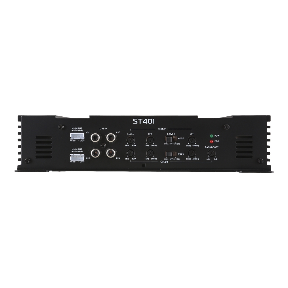 Audiophile Transistor output stage, dual differential input to eliminate any noise generated by the car radio, make that the new ST line can satisfy the most demanding audiophiles. Innovative amplifiers, capable of very high currents. Elegant and sophisticated design, all aluminum chassis. Built with quality materials, selected to enhance the most sophisticated installations and ensure the highest level of reliability. Extremely versatile, incorporating a wide range of functions associated with each other and able to configure complex audio systems, without the aid of external devices. Possibility of ignition with autosense, (arrival of the audio signal is switched on and goes out as soon goes away the audio signal), the input possibilities in High Level.